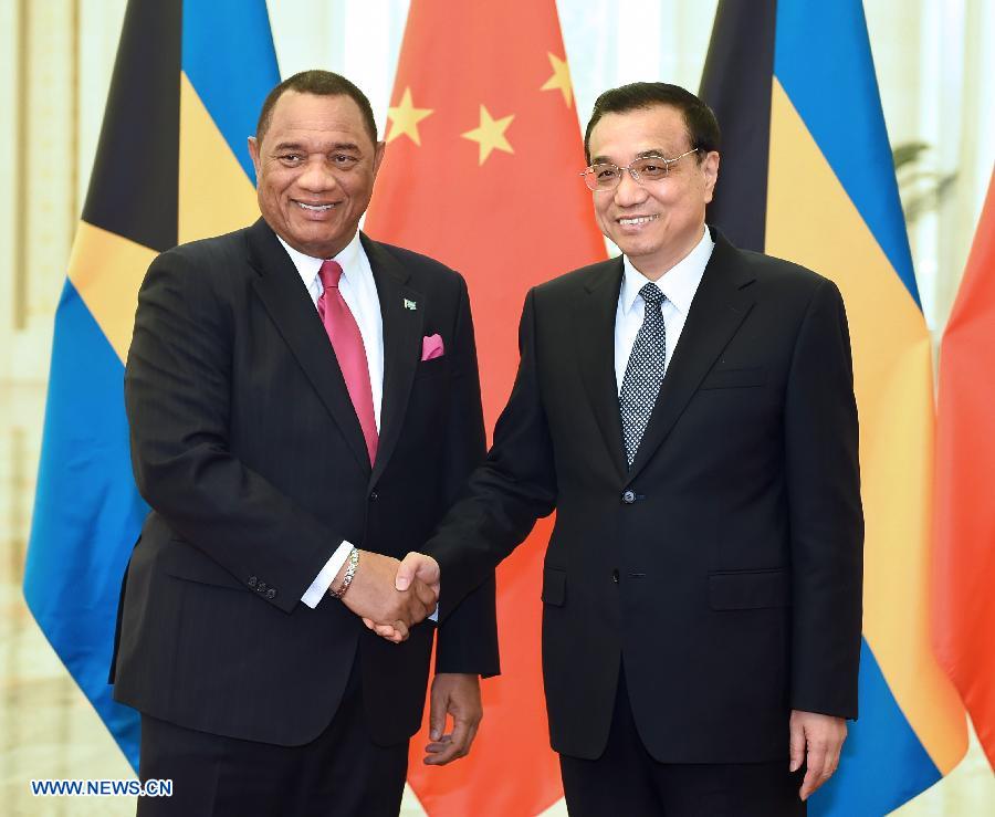 Chinese Premier Li Keqiang (R) meets with Bahamian Prime Minister Perry Christie, who is here to attend the First Ministerial Meeting of the Forum of China and the Community of Latin American and Caribbean States (CELAC), in Beijing, capital of China, Jan. 8, 2015. (Xinhua/Li Tao)