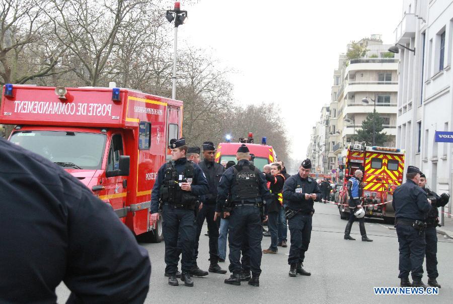 French police officers stand guard near the Paris office of Charlie Hebdo in Paris, France, Jan. 7, 2015. The office of Paris Prosecutor of the Republic confirmed at least 12 people were killed on Wednesday in a shooting at the Paris office of Charlie Hebdo, a satirical newspaper, adding four others were seriously wounded in the "terror attack." (Xinhua/Zheng Bin) |
