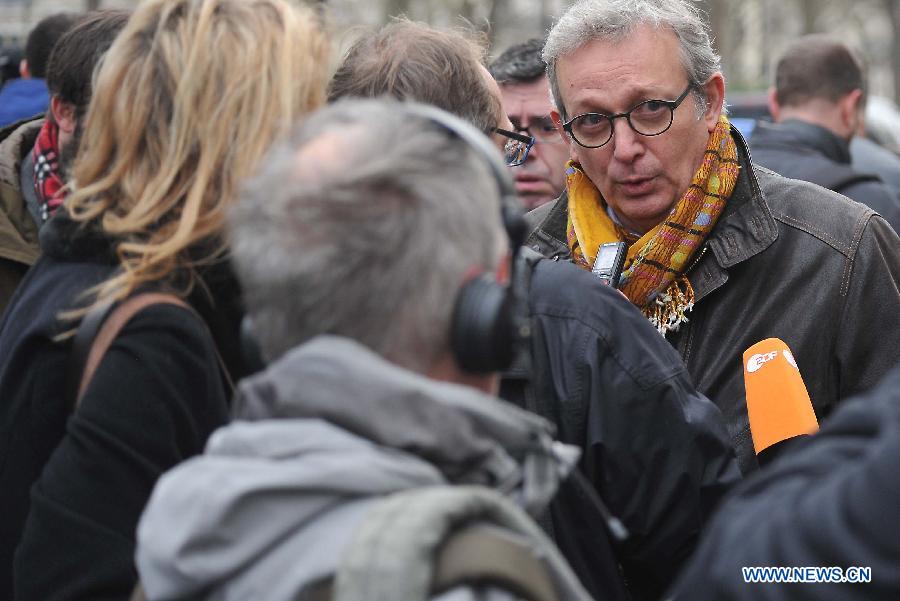 A witness (R) of the attack speaks to the media near the Paris office of Charlie Hebdo in Paris, France, Jan. 7, 2015. The office of Paris Prosecutor of the Republic confirmed at least 12 people were killed on Wednesday in a shooting at the Paris office of Charlie Hebdo, a satirical newspaper, adding four others were seriously wounded in the "terror attack." (Xinhua/Chen Xiaowei)