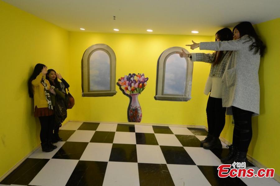 Visitors pose for a photo inside a room that uses 3D paintings to create optical illusions in Suzhou, east China's Jiangsu province on Jan. 7, 2015. The 3D painting exhibition also combines light show, art installations and sculptures. (CNS/Wang Sizhe) |