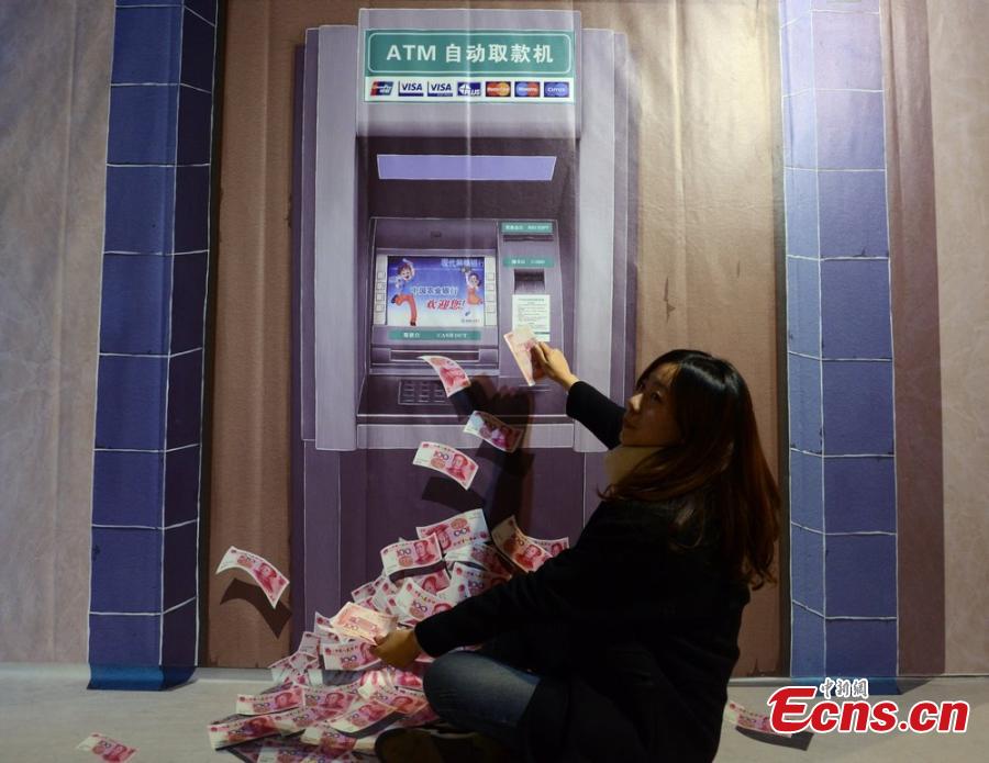 Visitors pose for a photo inside a room that uses 3D paintings to create optical illusions in Suzhou, east China's Jiangsu province on Jan. 7, 2015. The 3D painting exhibition also combines light show, art installations and sculptures. (CNS/Wang Sizhe) |