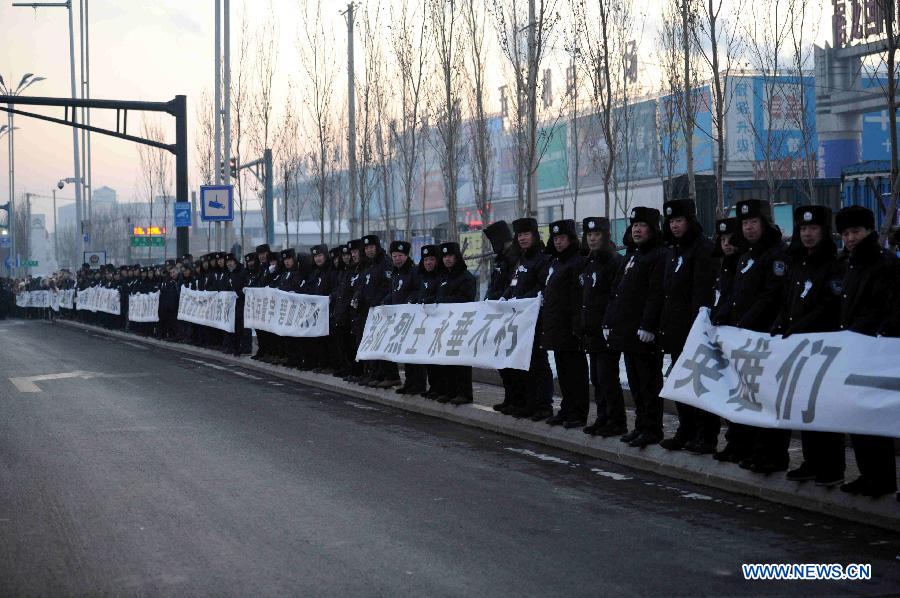 People attend the funeral for five firefighters in Harbin, capital of northeast China's Heilongjiang Province, Jan. 8, 2015. A serious fire broke out at a warehouse on Jan. 2 in Harbin that killed five firefighters. Of the deceased firefighters, the youngest was 18 years old and the oldest 22. (Xinhua/Wang Song)