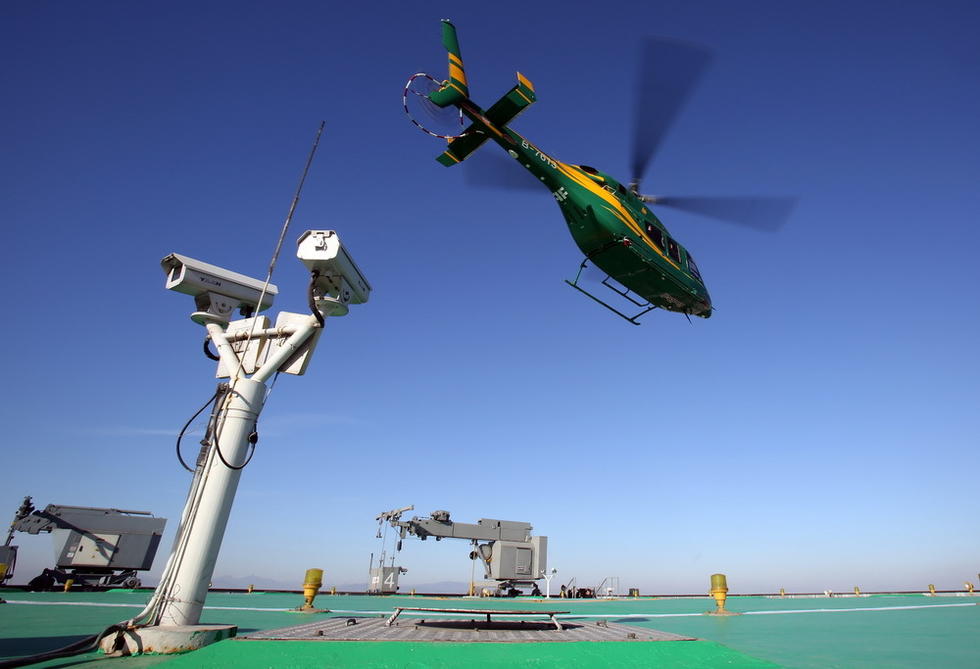 A Bell 429 helicopter lands on the parking apron of the 330-meter-high China World Trade Center Tower 3 on Jan. 6, 2015, which signifies that the highest parking apron in Beijing officially came into use. On that day, two other helicopters also landed on this parking apron. (Beijing News/Li Dong)