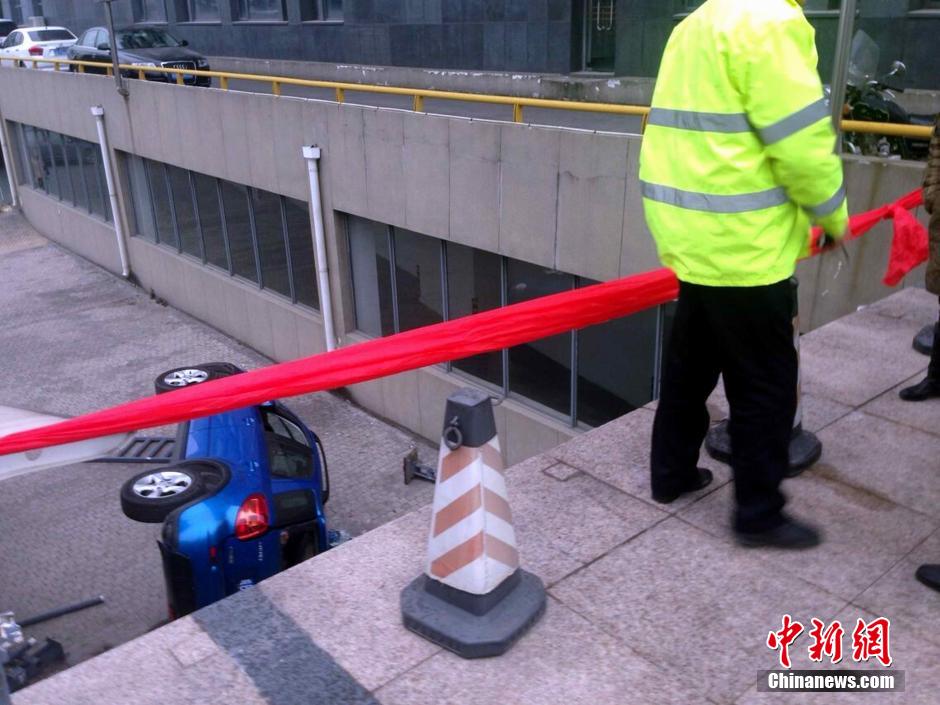 Due to negligence, a woman fell from a 6-meter-high platform when reserving her car in Wuhu, east China's Anhui province on Jan. 6. The car was severely damaged. Fortunately, the woman was miraculously unharmed, thanks to her seatbelt. (Photo/CNS)