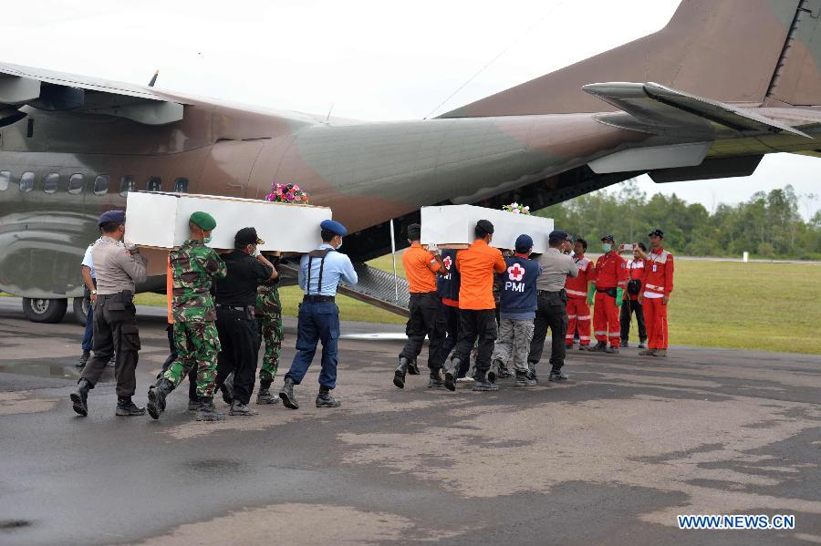 Rescuers carry coffins containing the bodies of victims of AirAsia flight QZ8501 to a transport plane in Pangkalan Bun, Indonesia, on Jan. 8, 2015. So far, 44 bodies have been discovered by a multinational search team. (Xinhua/He Changshan)