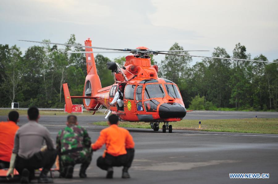 Members of the National Search And Rescue Agency wait before unloading the body of a victim of AirAsia Flight QZ8501 from a helicopter at Iskandar Air Force Base in Pangkalan Bun, Indonesia, Jan. 8, 2015. (Xinhua/Zulkarnain)