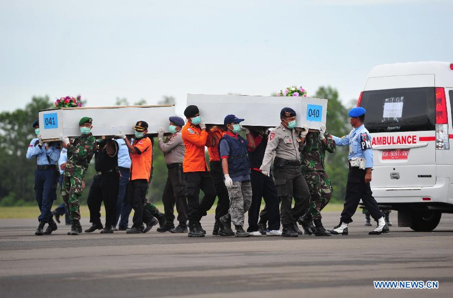 Members of the National Search And Rescue Agency carry coffins containing bodies of the victims of AirAsia Flight QZ8501 to transfer to Surabaya at Iskandar Air Force Base in Pangkalan Bun, Indonesia, Jan. 8, 2015. (Xinhua/Zulkarnain)