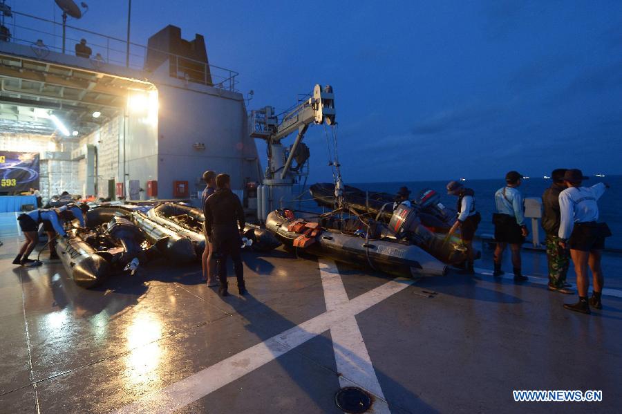 Indonesian Navy divers prepare to lift the tail of AirAsia Flight 8501 in Java sea, Indonesia, Jan. 9, 2015. Indonesia said on Jan. 7, 2015 it had found the tail of AirAsia Flight QZ8501, potentially marking a major step towards locating the plane's black boxes and helping shed light on what caused it to crash into the sea 10 days ago. (Xinhua/Adek Berry/Pool) |