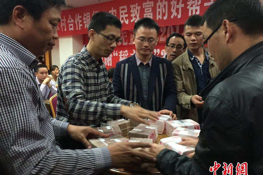 87 farmers receive a total of 2,889,000 yuan in bonuses on January 8, 2015, in south China's Hainan Province. [Photo: Chinanews.com]