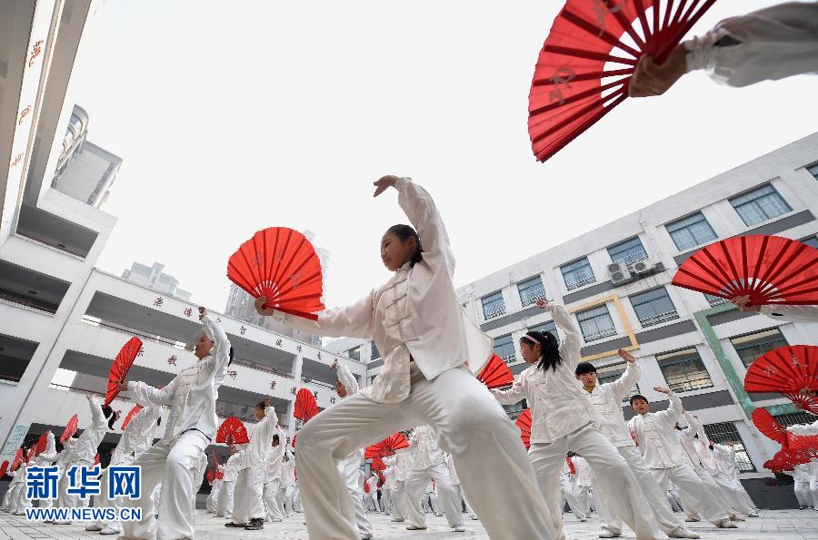 Students playing Tai Chi Kong Fu Fan form an eight-diagram pattern in Langxi Road Primary School, Yaohai, Hefei on Jan. 8, 2015. (Xinhua)