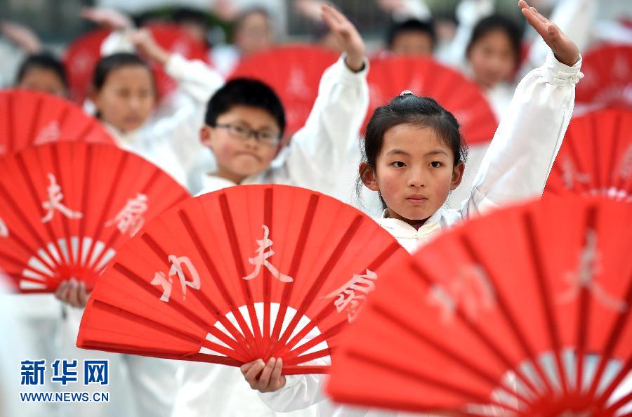 Students playing Tai Chi Kong Fu Fan form an eight-diagram pattern in Langxi Road Primary School, Yaohai, Hefei on Jan. 8, 2015. (Xinhua)
