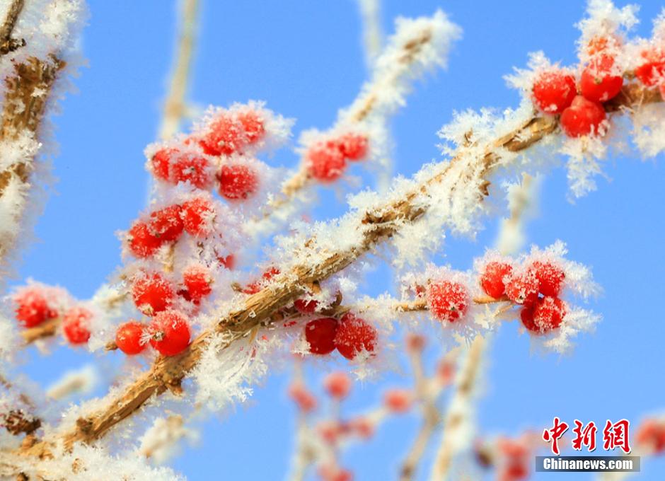 After several days of cold wave, intoxicating scenes of rime appear in Bohu county, Xinjiang, Jan. 9, 2015. People feel like in a fairyland at the Baixin Park of Bohu. (Chinanews/Nian Lei)