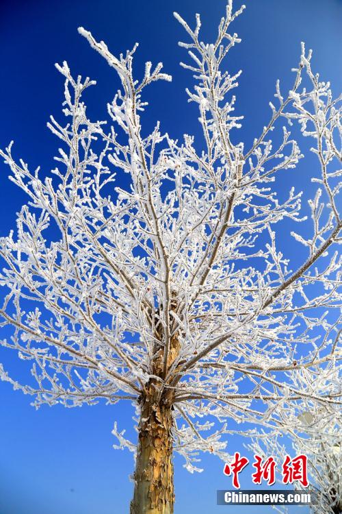 After several days of cold wave, intoxicating scenes of rime appear in Bohu county, Xinjiang, Jan. 9, 2015. People feel like in a fairyland at the Baixin Park of Bohu. (Chinanews/Nian Lei)