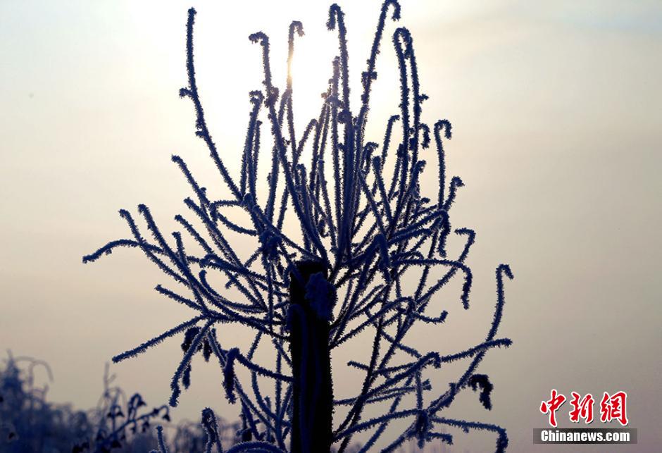 After several days of cold wave, intoxicating scenes of rime appear in Bohu county, Xinjiang, Jan. 9, 2015. People feel like in a fairyland at the Baixin Park of Bohu. (Chinanews/Nian Lei)