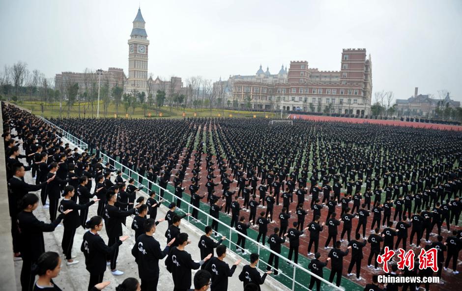 10,021 students from Sichuan Southwest College of Civil Aviation practice Wing Chun in Chengdu, southwest China's Sichuan province, Jan. 8, 2015. (CNS/Liu Zhongjun)