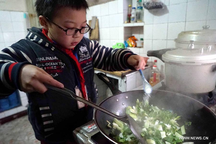Mo Shuangyi prepares dinner at his home in Tonggu County of Yichun, east China's Jiangxi Province, Jan. 9, 2015. After his father was diagnosed with leukemia in October 2014, Shuangyi, a 10-year-old schoolboy in Tonggu County, decided to collect recyclable wastes and sell them for money in order to save his father, who thought of giving up treatment because of high medical costs. His filial deeds caught extensive attention when pictures of him collecting wastes spread on the Internet. Shuangyi's family received public donations and a series of subsidies from local authorities soon after. The boy has now returned to school to focus on his education. (Xinhua/Chen Zixia) |