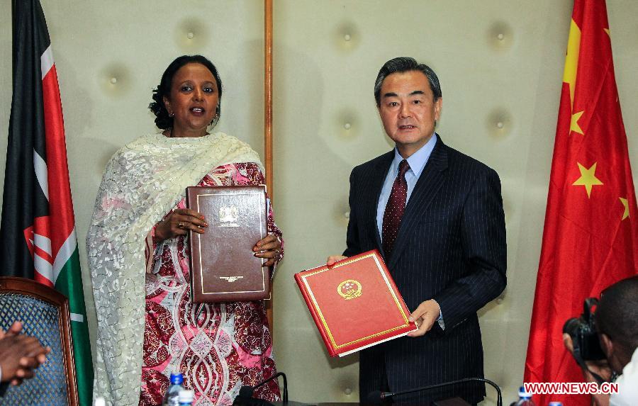 Chinese Foreign Minister Wang Yi (R) and his Kenyan counterpart Amina Mohamed attend the signing ceremony of a memorandum of understanding after their talks in Nairobi, capital of Kenya, Jan. 10, 2015. (Xinhua/Meng Chenguang)
