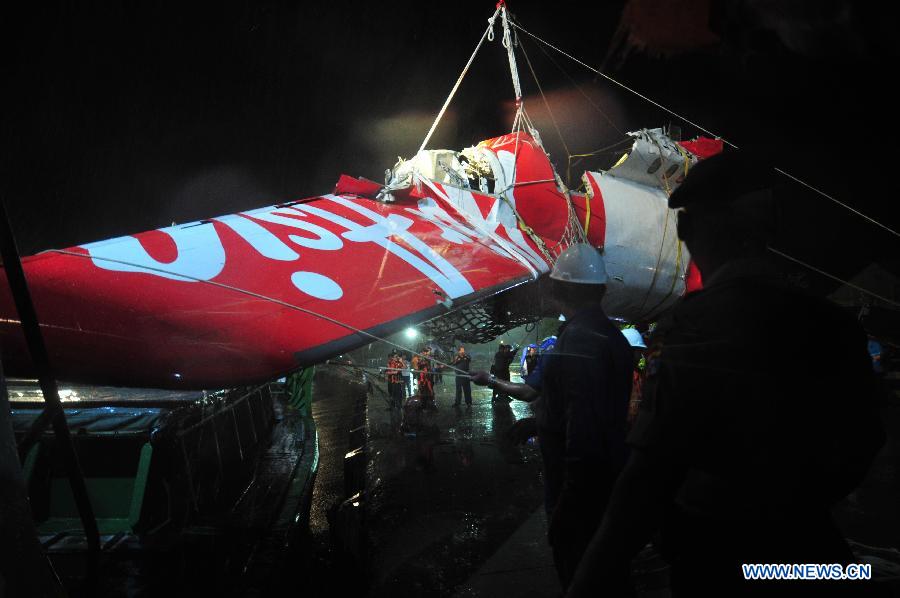 The tail part of crashed AirAsia flight QZ8501 is transferred from Crest Onyx ship in the port of Kumai, Pangkalan Bun, Indonesia, Jan. 11, 2015. (Xinhua/Zulkarnain)
