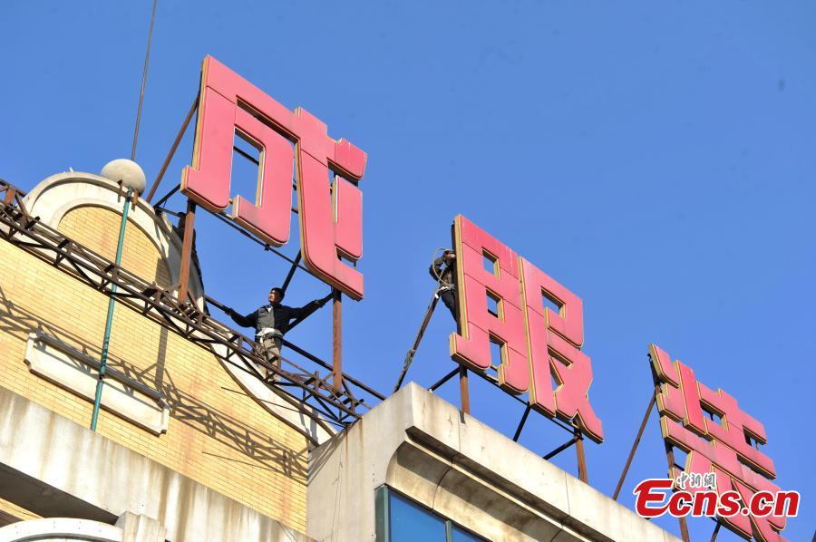 Workers remove signs atop a wholesale mall at Beijing Zoo Market in the city’s Xicheng district on January 11, 2015. The mall named “Tianhaocheng” was the first one in the wholesale market area that had its signs removed. Most wholesalers have already moved out of the mall. With a business area of more than 300,000 square meters and 13,000 stalls, the Beijing Zoo Market represents the largest clothing wholesale distribution center in North China. The relocation project over the market is designed to improve downtown functions and relieve overcrowding and traffic jams. [Photo: chinanews.com/ Jin Shuo] |