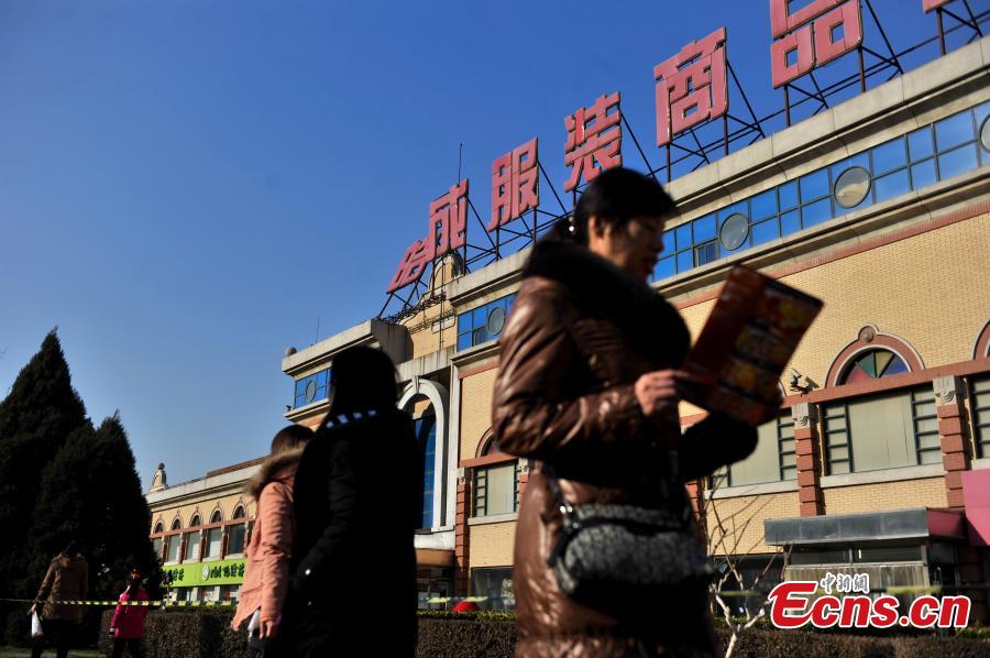 Workers remove signs atop a wholesale mall at Beijing Zoo Market in the city’s Xicheng district on January 11, 2015. The mall named “Tianhaocheng” was the first one in the wholesale market area that had its signs removed. Most wholesalers have already moved out of the mall. With a business area of more than 300,000 square meters and 13,000 stalls, the Beijing Zoo Market represents the largest clothing wholesale distribution center in North China. The relocation project over the market is designed to improve downtown functions and relieve overcrowding and traffic jams. [Photo: chinanews.com/ Jin Shuo] |