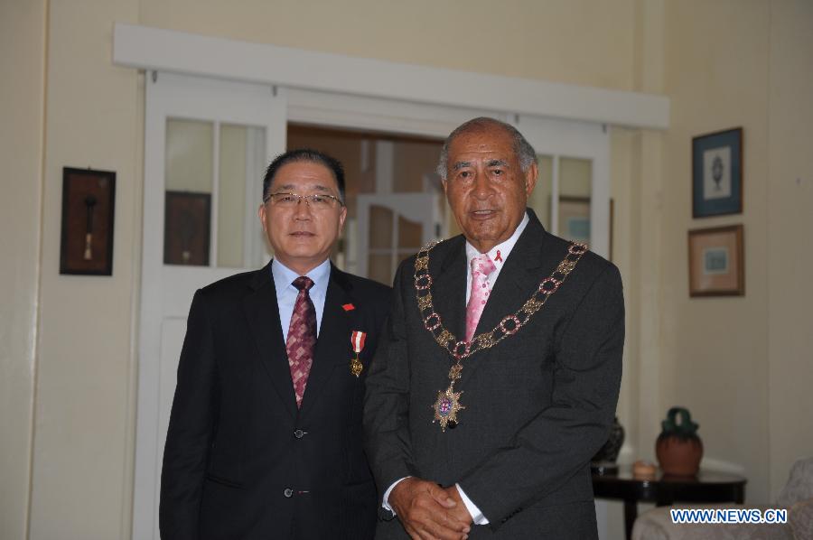 Fijian President Ratu Epeli Nailatikau (R) poses for photos with Chinese Ambassador to Fiji Huang Yong after awarding him the Honorary Officer of the Order of Fiji under the Fiji Honours System in Suva, Fiji, Jan. 12, 2015. Nailatikau thanked Huang Yong for the continuous efforts in strengthening relations between Fiji and China during his three and half-year term in Fiji. (Xinhua/Michael Yang) |