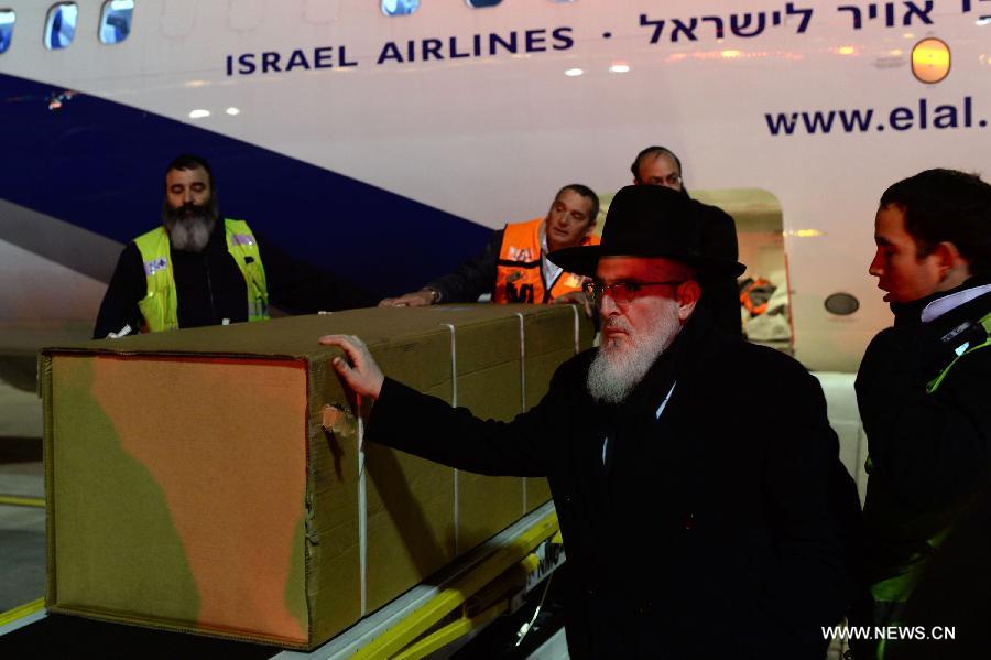 | Bodies of victims who were killed in an attack on a Jewish supermarket in Paris arrive in Ben Gurion Airport near Tel Aviv, Israel, on Jan. 13, 2015. The four victims who were killed in an attack on a Jewish supermarket in Paris will be buried in Jerusalem, the Prime Minister's Office announced Sunday in a statement. The statement said the Prime Minister Benjamin Netanyahu accepted requests made by the families of the victims and ordered Israeli authorities to make proper arrangements to transfer the bodies to Jerusalem. It added that funerals are set to take place on Tuesday. (Xinhua/GPO/Kobi Gideon) |