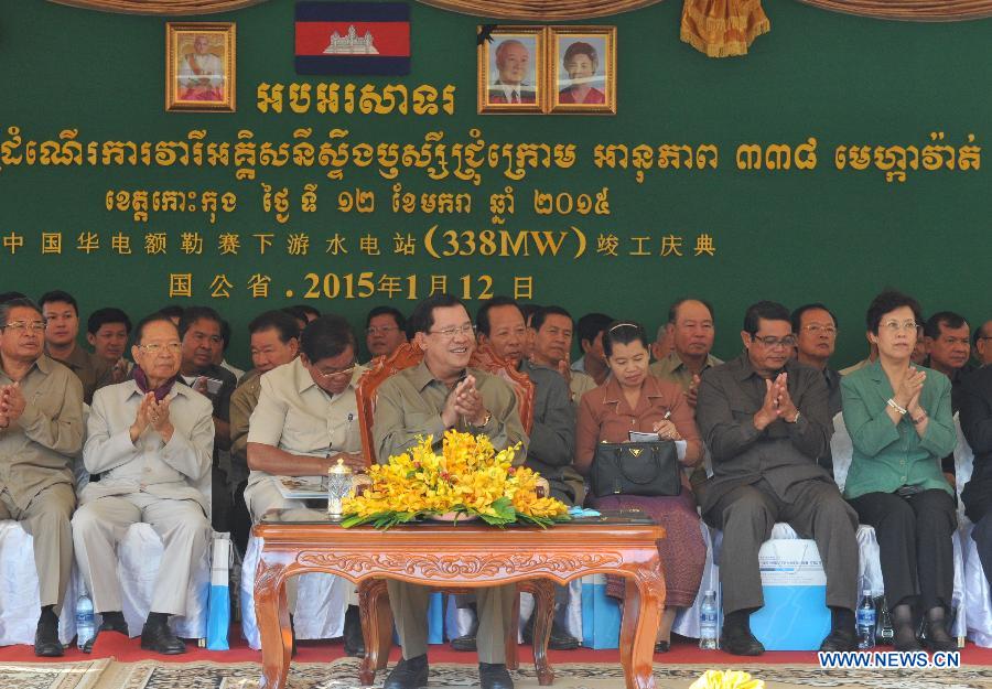 Cambodian Prime Minister Hun Sen (C, front) presides over the inauguration ceremony of the Chinese-built 338-megawatt Russei Chrum Krom River hydropower dam in Koh Kong province, Cambodia, Jan. 12, 2015. The hydroelectric dam, Cambodia's largest hydropower station so far, commenced operation on Monday after it had been constructed for nearly five years. (Xinhua/Li Hong) |