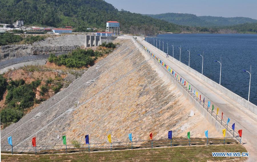 Photo taken on Jan. 12, 2015 shows the Chinese-built 338-megawatt Russei Chrum Krom River hydropower dam in Koh Kong province, Cambodia. The hydroelectric dam, Cambodia's largest hydropower station so far, commenced operation on Monday after it had been constructed for nearly five years. (Xinhua/Li Hong) |