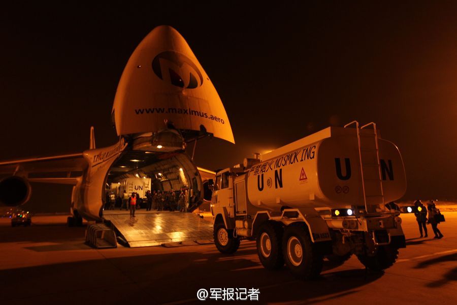 China's first team of peacekeeping battalion departs from east China's Shandong province, Jan. 8, 2015. The team consists of 24 soldiers. Six flew from Yaoqiang Airport in Jinan and 18 flew from Laishan Airport in Yantai. The six soldiers escorted materials and equipment in a An-124 cargo plane. (Photo/81.cn) |