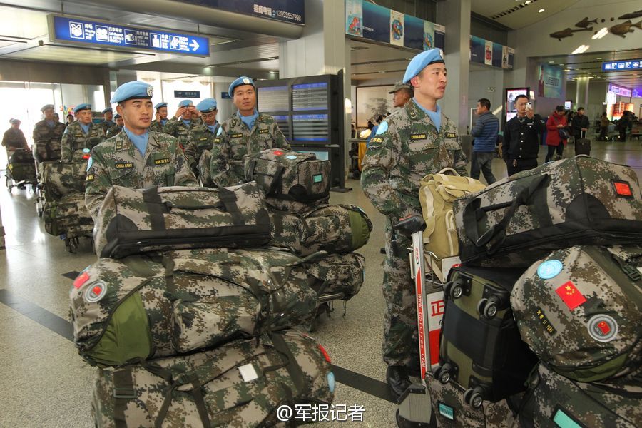 China's first team of peacekeeping battalion departs from east China's Shandong province, Jan. 8, 2015. The team consists of 24 soldiers. Six flew from Yaoqiang Airport in Jinan and 18 flew from Laishan Airport in Yantai. The six soldiers escorted materials and equipment in a An-124 cargo plane. (Photo/81.cn)