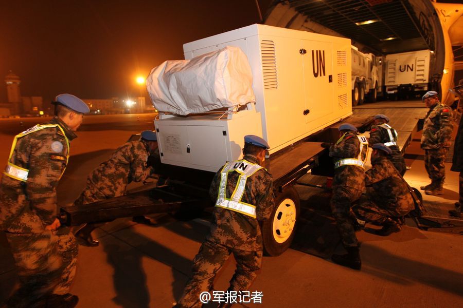 China's first team of peacekeeping battalion departs from east China's Shandong province, Jan. 8, 2015. The team consists of 24 soldiers. Six flew from Yaoqiang Airport in Jinan and 18 flew from Laishan Airport in Yantai. The six soldiers escorted materials and equipment in a An-124 cargo plane. (Photo/81.cn) |
