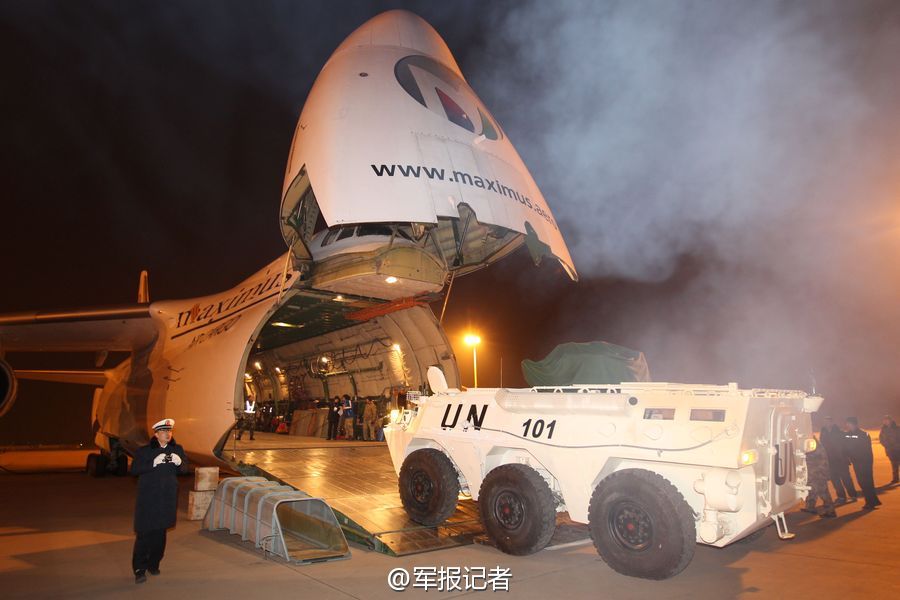 China's first team of peacekeeping battalion departs from east China's Shandong province, Jan. 8, 2015. The team consists of 24 soldiers. Six flew from Yaoqiang Airport in Jinan and 18 flew from Laishan Airport in Yantai. The six soldiers escorted materials and equipment in a An-124 cargo plane. (Photo/81.cn) |