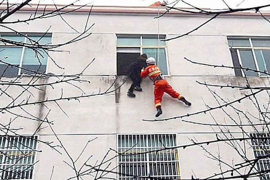 A Chinese firefighter saves a woman who wants to jump off a building. (Photo/Xinhua)