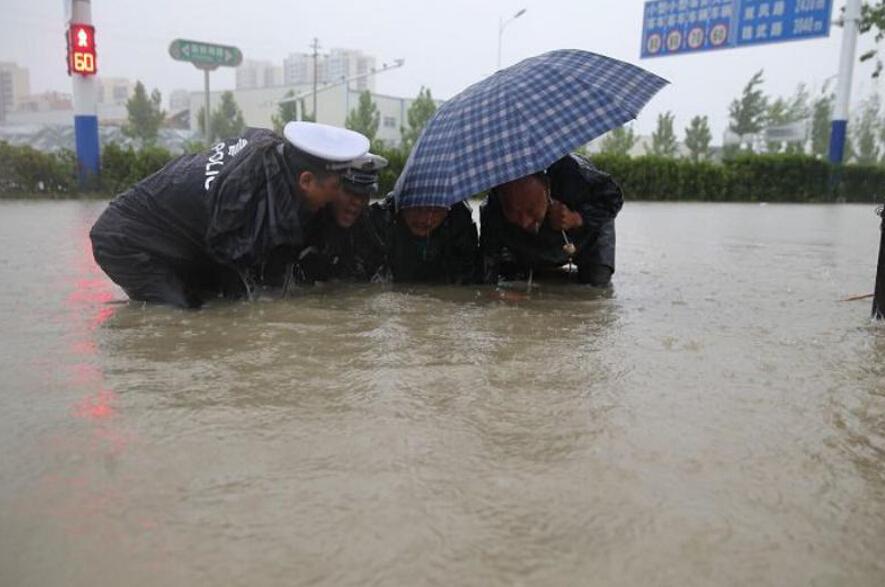 Chinese policemen rush to a flooding area to clean up a choked drainage. (Photo/Xinhua)