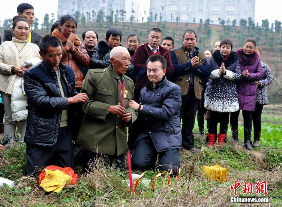 Zhang Tiliu, who was once named Liu Keqiang, was born in Songjiang, Meishan of China’s Sichuan province. During the Anti-Japanese War, he left his hometown to took part in battles in western Yunnan. After the victory of the war, Zhang Tiliu settled down in Tengchong, Yunnan province and has lived there since then. He finally came back to his hometown in Meishan and reunited with his family after 74-year separation. (Chinanews.com/Zhong Xin)
