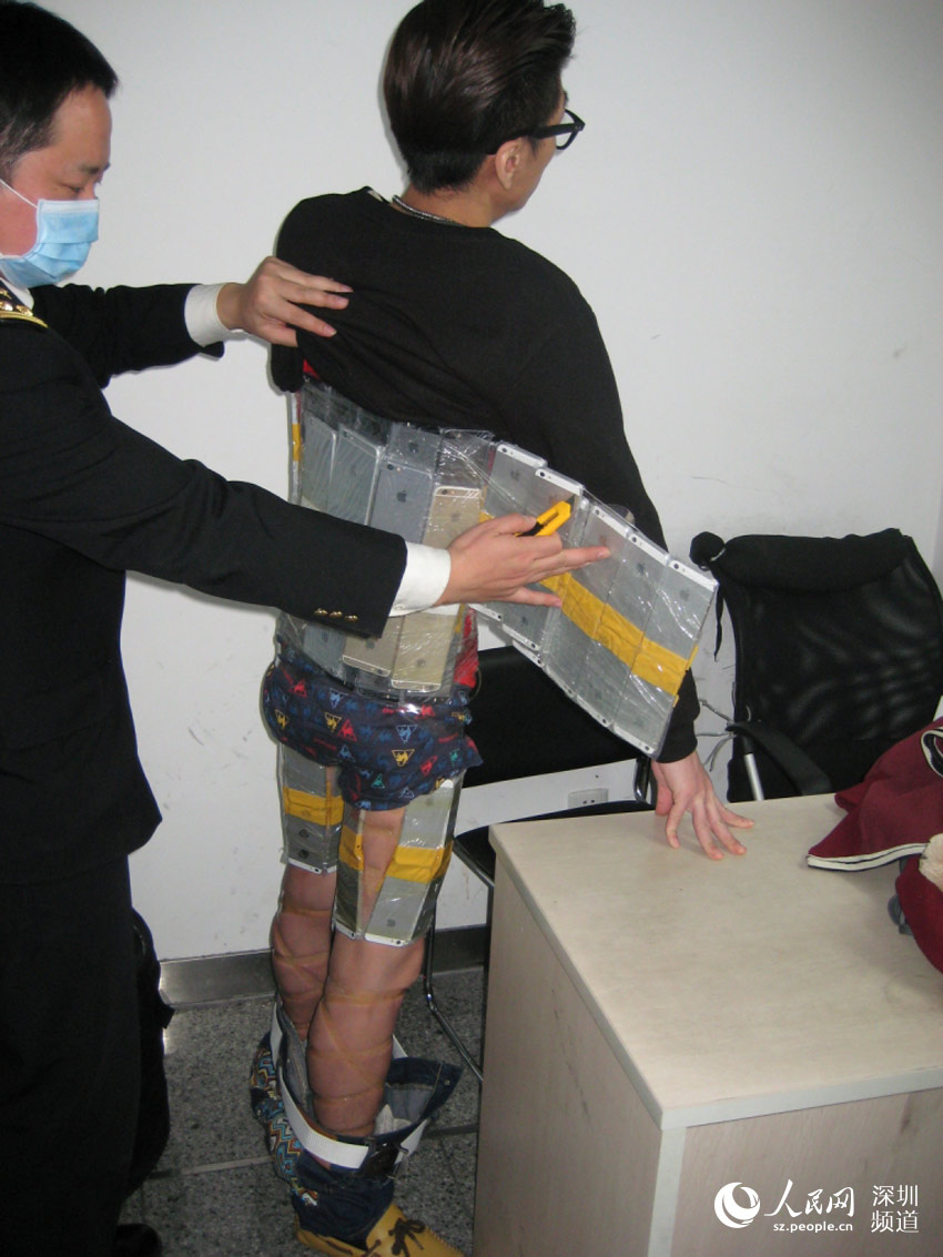 On Jan. 11, a Hong kong man who tried to sneak 94 iPhones into China are caught at the Futian Port, Shenzhen. The man’s strange walking posture aroused attention of the customs officers who then stopped him and found 94 iPhones strapped to his torso, which are worth 300,000 yuan. (Photo/People.cn) |
