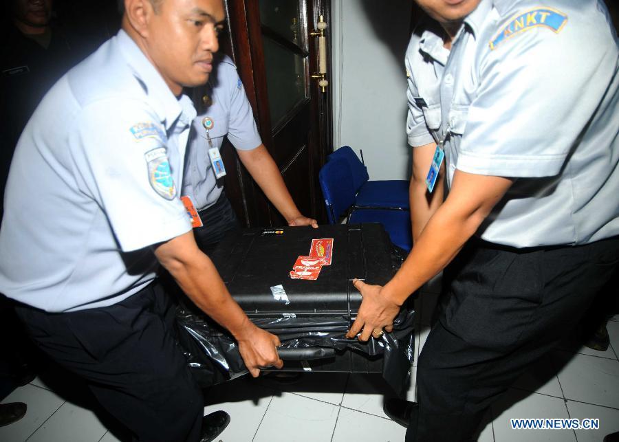 Indonesia's National Transportation Safety Committee (KNKT) members carry the hardcase with Cockpit Voice Recorder (CVR) of the AirAsia Flight QZ8501 in Jakarta, Indonesia, Jan 13, 2015. A senior official from the Indonesian National Search and Rescue Agency (BASARNAS) told Xinhua on Tuesday that the CVR from the crashed AirAsia flight has been recovered. (Xinhua/Agung Kuncahya B.)