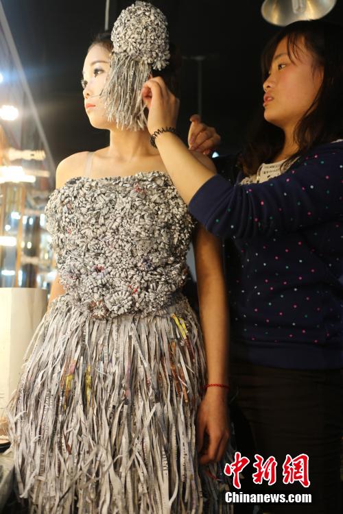 A student in Chengdu Polytechnic wears a self-designed paper wedding dress, Jan. 12, 2015. (CNS/Zhang Lang)