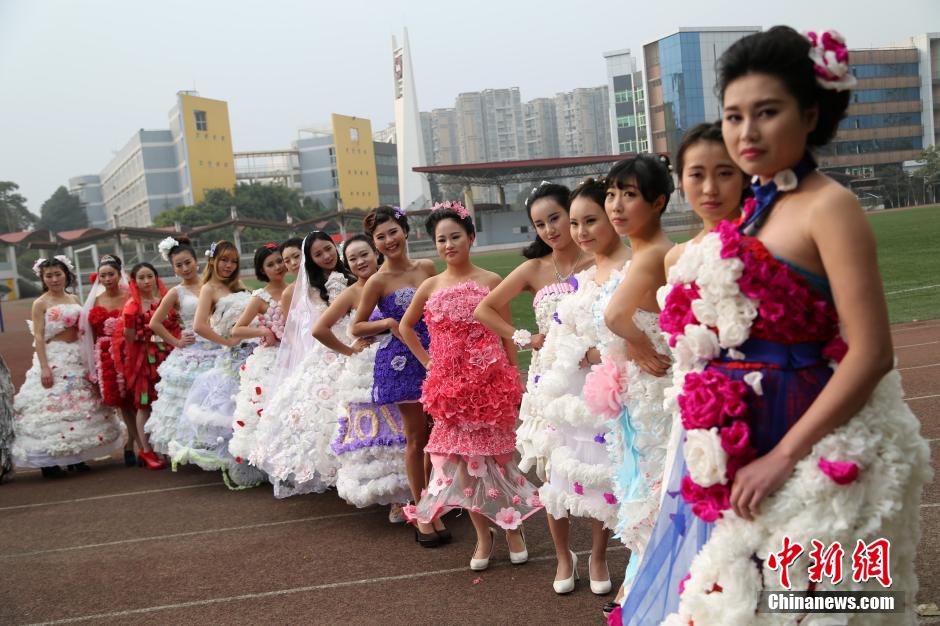 After half a month's preparation, 26 students in Chengdu Polytechnic made a series of wedding dresses from waster paper. They gave a special wedding dress show on the campus playground as their answers to the final exam.