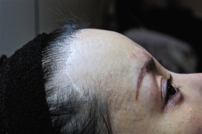 Plastic surgery in Korea left Mi's nose infected and deformed, and destroyed the sense of touch at the front of her scalp. A 20 cm-long scar was left on her hairline, and she lost a lot of hair. (Photo/Beijing News)