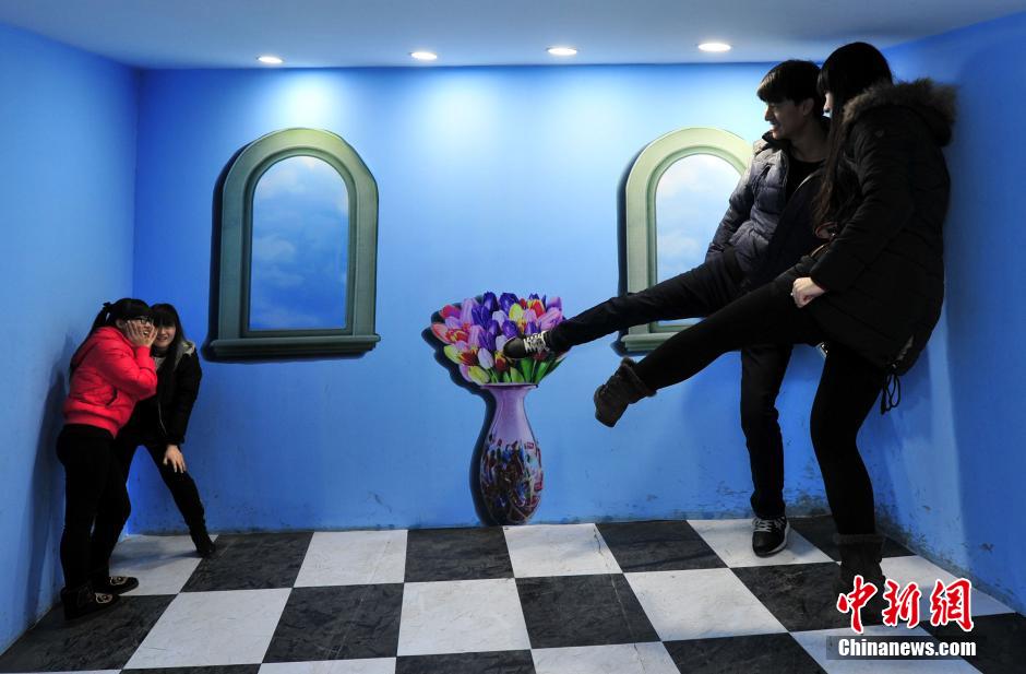 A lot of young people were attracted to the new 3D art gallery in Shijiazhuang on Jan. 13, 2015. Hundreds of different 3D experiences presented visitors with a thrilled and unforgettable journey