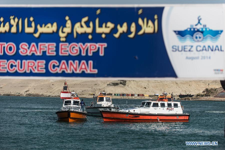 Pilot ships are seen on the Suez Canal in Ismailia, Egypt, on Jan. 14, 2015. Egypt launched the new waterway project in August 2014, and the construction was ordered by Egyptian President Abdel-Fattah al-Sisi to be completed in one year. (Xinhua/Pan Chaoyue) |