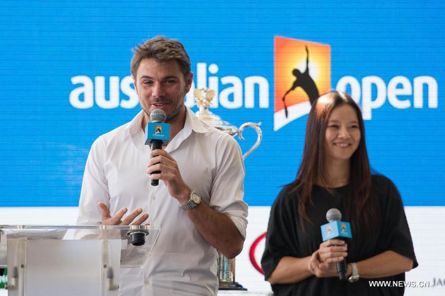 Swiss tennis player Stan Wawrinka (L) and former Chinese tennis player Li Na (R) attend the official draw ceremony of 2015 Australian Open tennis tournament at Melbourne Park in Melbourne, Australia, Jan. 16, 2015. (Xinhua/Bai Xue)