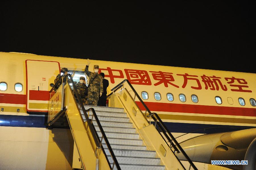 Members of the Chinese medical team assisting in the prevention and control of the Ebola virus in Liberia wave as returning to Chongqing, southwest China, Jan. 16, 2015. A total of 82 medical workers, as the first batch of the 164-member team, returned to motherland on Friday morning. The rest of the group will return on Jan. 22. (Xinhua/Tang Yi) |