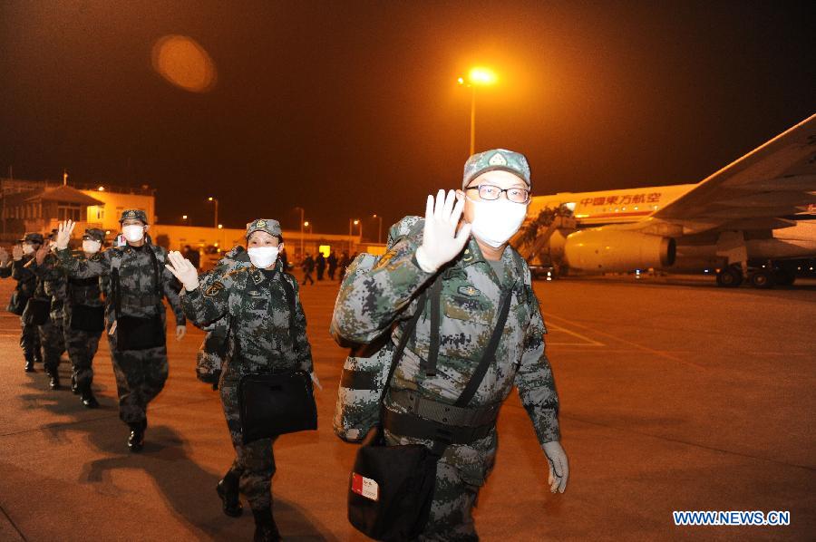 Members of the Chinese medical team assisting in the prevention and control of the Ebola virus in Liberia wave as returning to Chongqing, southwest China, Jan. 16, 2015. A total of 82 medical workers, as the first batch of the 164-member team, returned to motherland on Friday morning. The rest of the group will return on Jan. 22. (Xinhua/Tang Yi) |