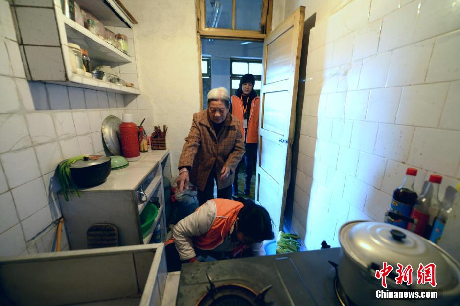 Visiting nurses clean the kitchen for Zheng Wanrong. (Chinanews/Wang Dongming)