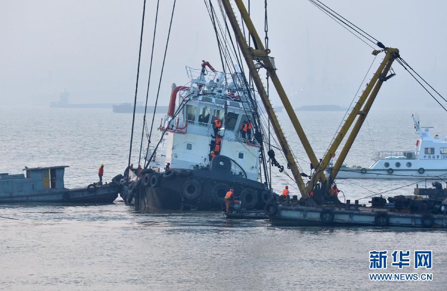 NANJING, Jan. 17 -- Rescuers have lifted a capsized tug boat to the surface of water from the Yangtze River in east China, 40 hours after it sank in a channel in Jiangsu Province.