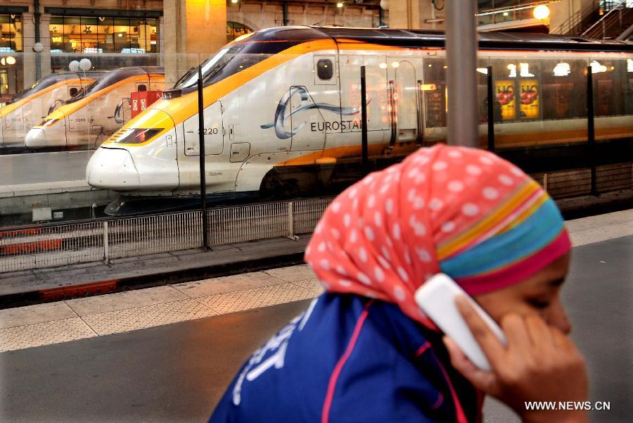 A passenger makes a phone call besides a Eurostar train at the Gare du Nord train station in Paris, France, Jan. 17, 2015. All services of Eurostar were suspended Saturday due to smoke detection in the Channel Tunnel, Eurostar announced Saturday. All trains were returning to original stations as the Channel Tunnel linking Britain and France was closed until further notice, Eurostar's customer care team said on its Twitter account. (Xinhua/Chen Xiaowei) |