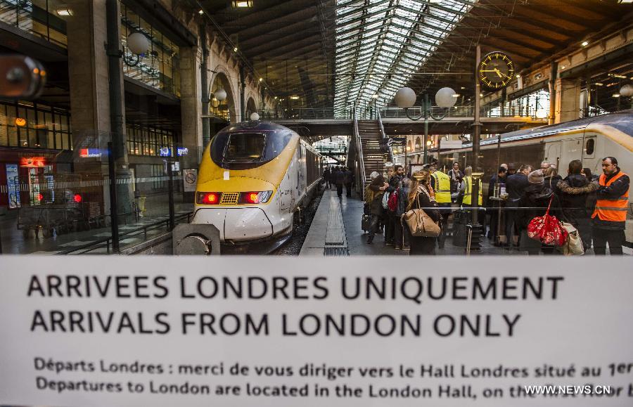 Passengers get off a Eurostar train that reversed from the Channel Tunnel due to a fire alarm at the Gare du Nord train station in Paris, France, Jan. 17, 2015. All services of Eurostar were suspended Saturday due to smoke detection in the Channel Tunnel, Eurostar announced Saturday. All trains were returning to original stations as the Channel Tunnel linking Britain and France was closed until further notice, Eurostar's customer care team said on its Twitter account. (Xinhua/Chen Xiaowei) |