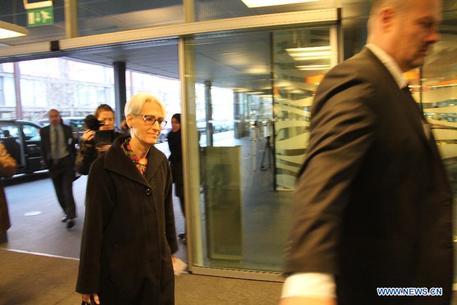 U.S. Under secretary of State Wendy Sherman(L front) arrives for the new round of Iran nuclear talks in Geneva, Switzerland, on Jan. 18, 2015. The new round of negotiations over Iran's long-standing controversial nuclear program broadened the consensus, said the head of Chinese delegation to the talks on Sunday. (Xinhua/Zhang Miao) |